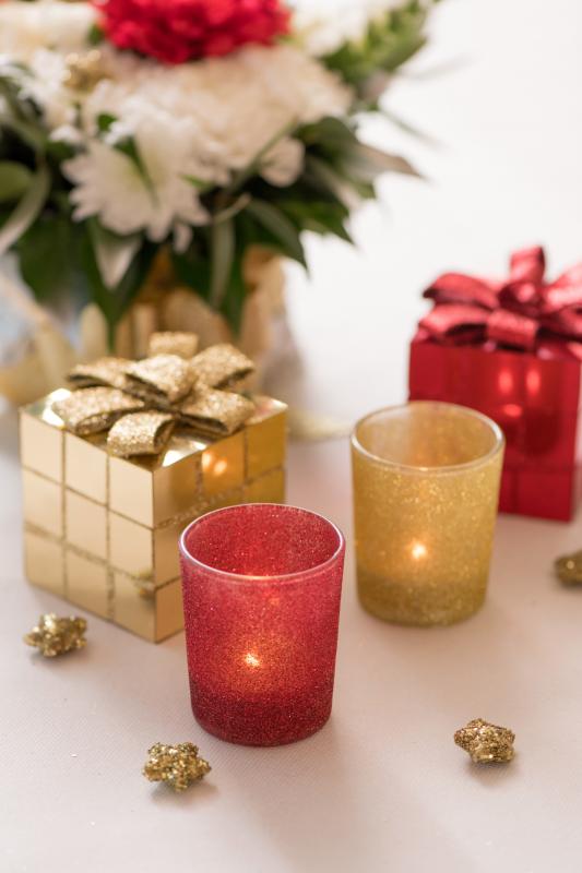 Ozdobte svůj slavnostní štědrovečerní stůl těmito svícny s červenými glitry.