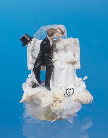 Svatební figurky ženich a nevěsta na lavičce