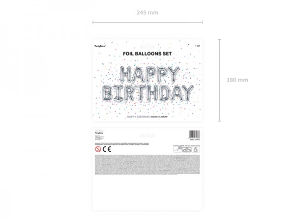 Nafukovací fóliové balónky ve tvaru písmen pro vytvoření nápisu Happy Birthday. Balónky jsou ve stříbrné barvě.