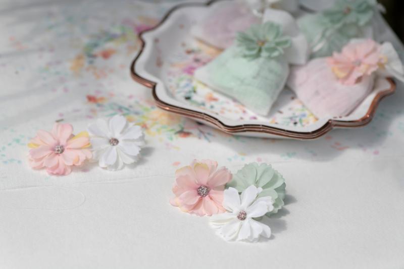 Něžné textilní dekorativní květiny k dekoraci a k ozdobení vašeho narozeninového nebo svatebního stolu.