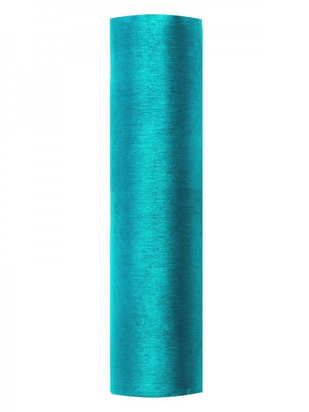 Organza hladká, tyrkysová 16cm/9m. Je vhodná pro dekoraci svatební tabule, židlí, ale také prostoru - slavobrány, sloupů, vchodových dveří… Organzu můžete použít na zdobení květin, aut, ale také obřadních prostor - kostela i pro svatbu venku. Kromě slavnostních událostí můžete organzu využít také pro výzdobu bytů. S organzou se krásně pracuje, je průsvitná, lehká, dobře tvarovatelná. Organzu můžete kombinovat s tylem nebo materiálem MESH.