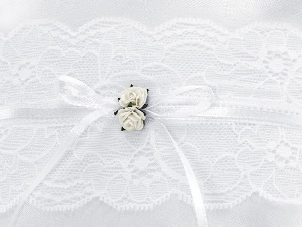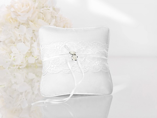 Polštářek na prstýnky malý, zdobený bílou s krajkou. Polštářek doplňují dvě bílé růžičky. Rozměr polštářku: 16 x 16 cm