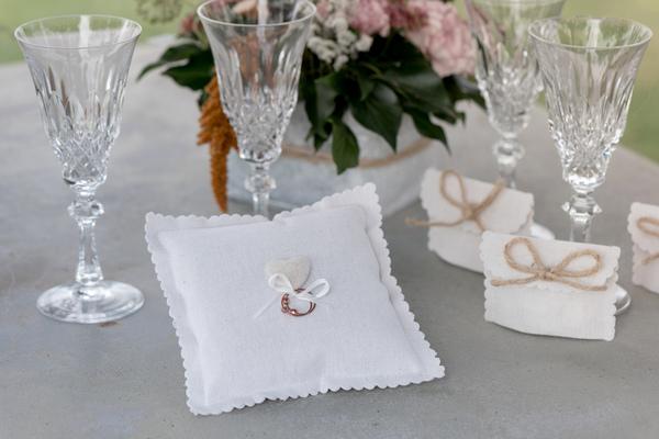 Bavlněný svatební polštářek na prstýnky se srdíčkem a saténovou stuhou v bílé barvě.