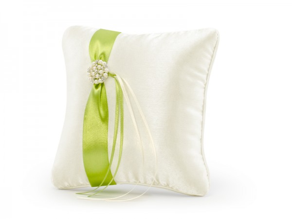 Polštářek na prstýnky se zelenou stuhou a perlovou broží