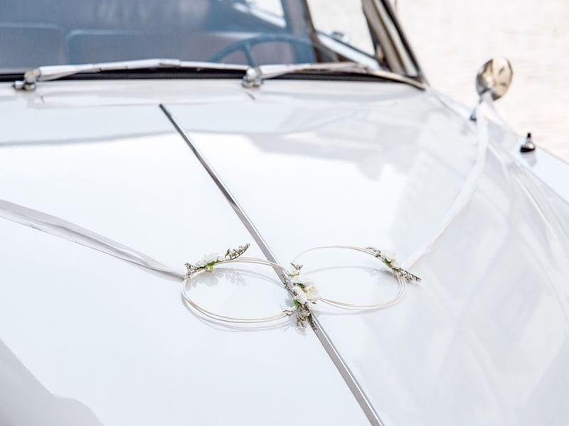 Součástí jsou dva spojené kroužky na kapotu (průměr 18 cm, délka stužek k upevnění 220 cm) a 4 kroužky na kliku (průměr 8 cm, délka stužek 138 cm).