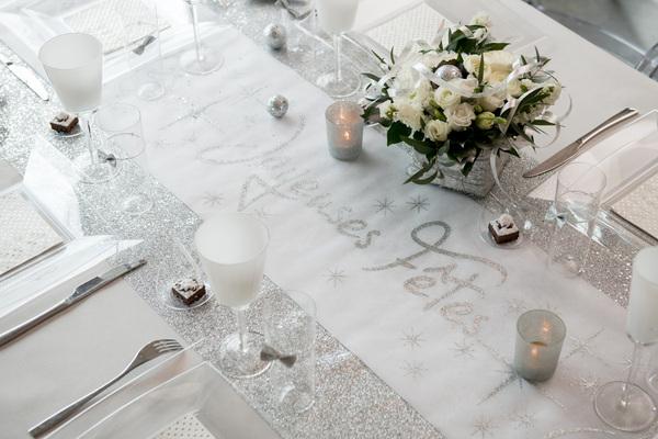 Středová stolová dekorační šerpa stříbrná s glitry.