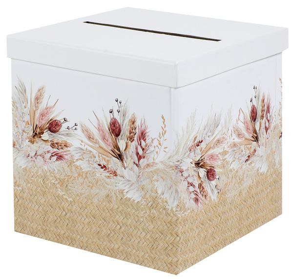Svatební box na přání a peníze. Tak tímto doladíte svatbu do posledního detailu! Do krabice s vrchním otvorem mohou svatební hosté vhazovat po celou dobu svatby přání a vzkazy do Vašeho společného života nebo ji lze využít na svatební dary v podobě obálek s penězi. Box je vyroben z pevného recyklovaného papíru, na jeho pohledové straně je nalepena černá tvarovaná tabulka s bílým rámečkem, určená pro Váš vlastní text . Krabici na přání dodáváme v rozloženém stavu.