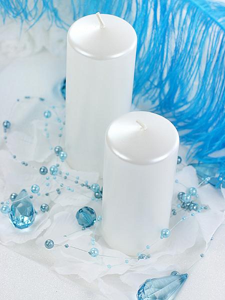 Metalická svíčka na stůl ve tvaru válce v perleťové barvě.