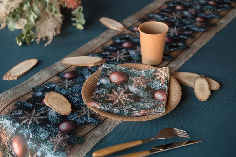 Vánoční přírodní ubrousky. Ubrousky zdobí zasněžené jehličí a vánoční ozdoby.