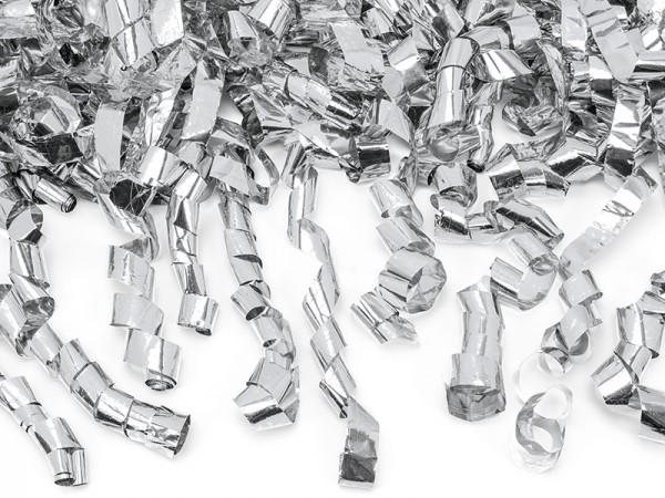 Atraktivní vystřelovací 60 cm dlouhé metalické konfety vhodné pro venkovní i vnitřní použití. Balení obsahuje stříbrné konfety s kovově lesklým efektem.